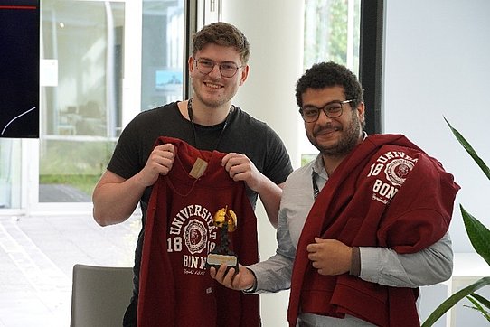 Following the intensive work phase, the three best teams selected by the jury – undefined, fsk and Code Geass – pitched their solutions on the big stage. Niklas Dobberstein and Amr Moustafa of the team undefined were then chosen as the winners by the jury and received their trophy and jumper from the University of Bonn on stage. The two M.Sc. Computer Science students of the University of Bonn achieved the best prediction performance and put the results into a target-oriented medical context. At the end of the afternoon, all participants went home with numerous inspirations and exciting insights – the best prerequisites for a successful repetition of this interdisciplinary event at the interface between computer science and medicine.
